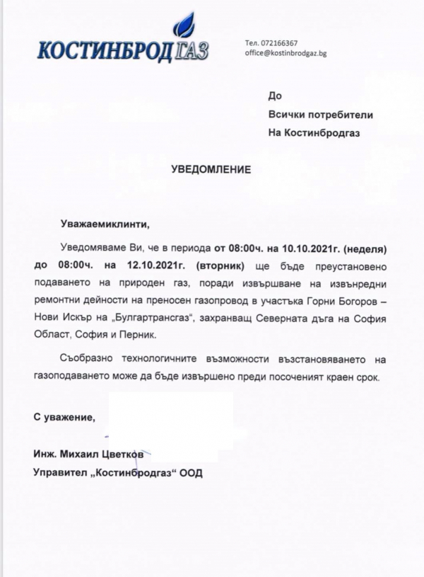 Причината за спирането на подаването на природен газ е извършване на извънредни ремонтни дейности, става ясно от уведомление от Костинброд Газ, публикувано на страницата на Община Костинброд.