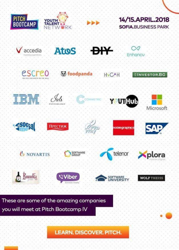 На 14 и 15 април 2018 г. в Бизнес Парк София ще се проведе Pitch Bootcamp. Събитието е двудневен кариерен обучителен семинар, който ще събере заедно студенти и наскоро завършили младежи с някои от най-успешните компании.