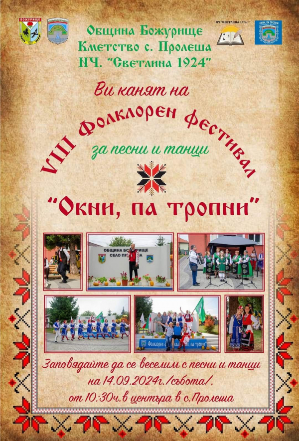 За осма поредна година, село Пролеша е домакин на вече утвърдения за община Божурище фестивал „Окни, па тропни“. Тази година, събитието ще се проведе на14 септември /събота/ от 10.30 ч., пред НЧ „Светлина 1924“, на центъра на селото. Всички жители и гости на община Божурище са добре дошли!