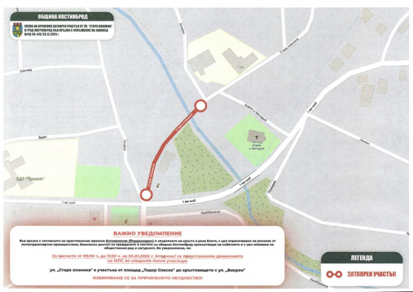 Ограничението ще бъде в сила на 6 януари 2026 г. (вторник) за времето от 09:00 ч. до 11:30 ч. и ще обхваща ул. „Стара планина“ в участъка от площад „Тодор Спасов“ до кръстовището с ул. „Вихрен“.