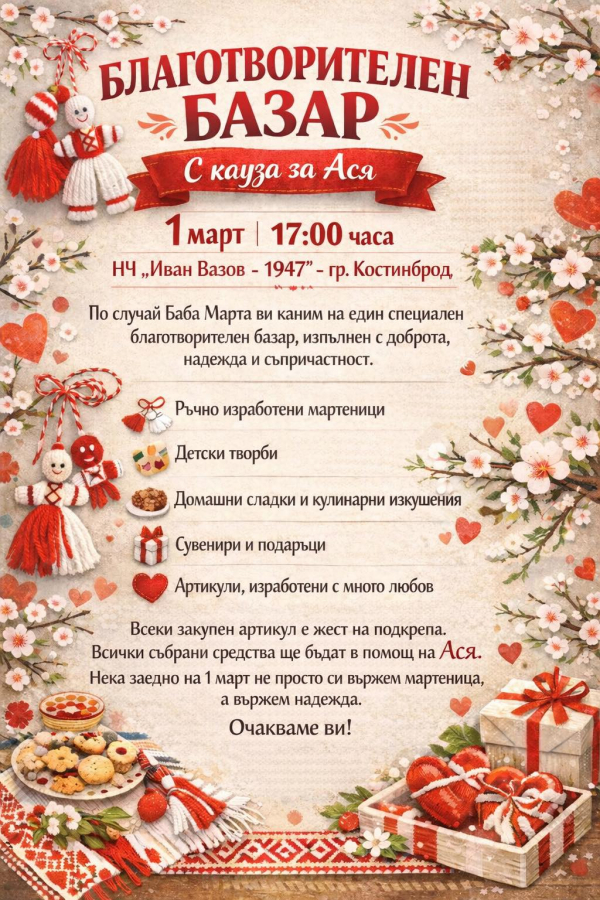 Благотворителен базар в подкрепа на Ася ще се проведе на 1 март от 17:00 часа в Народно читалище „Иван Вазов – 1947“ в Костинброд. Инициативата се организира по повод Баба Марта и ще обедини местната общност около кауза, свързана с подкрепа и съпричастност.