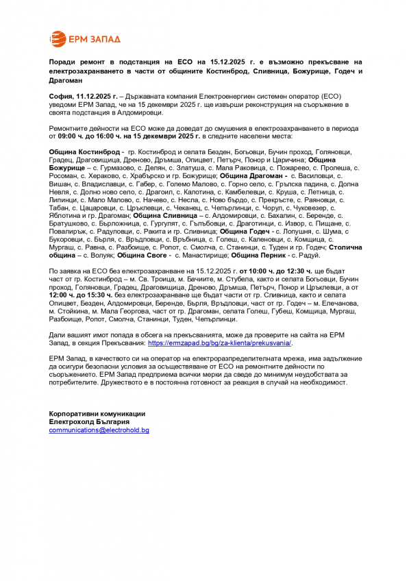Поради ремонт в подстанция на ЕСО е възможно прекъсване на електрозахранването в части от общините Костинброд, Сливница, Божурище, Годеч, Своге и Драгоман. Ремонтните дейности на ЕСО може да доведат до смущения в електрозахранването в периода от 09:00 ч. до 16:00 ч. на 15 декември 2025 г. За това информират от Община Костинброд.